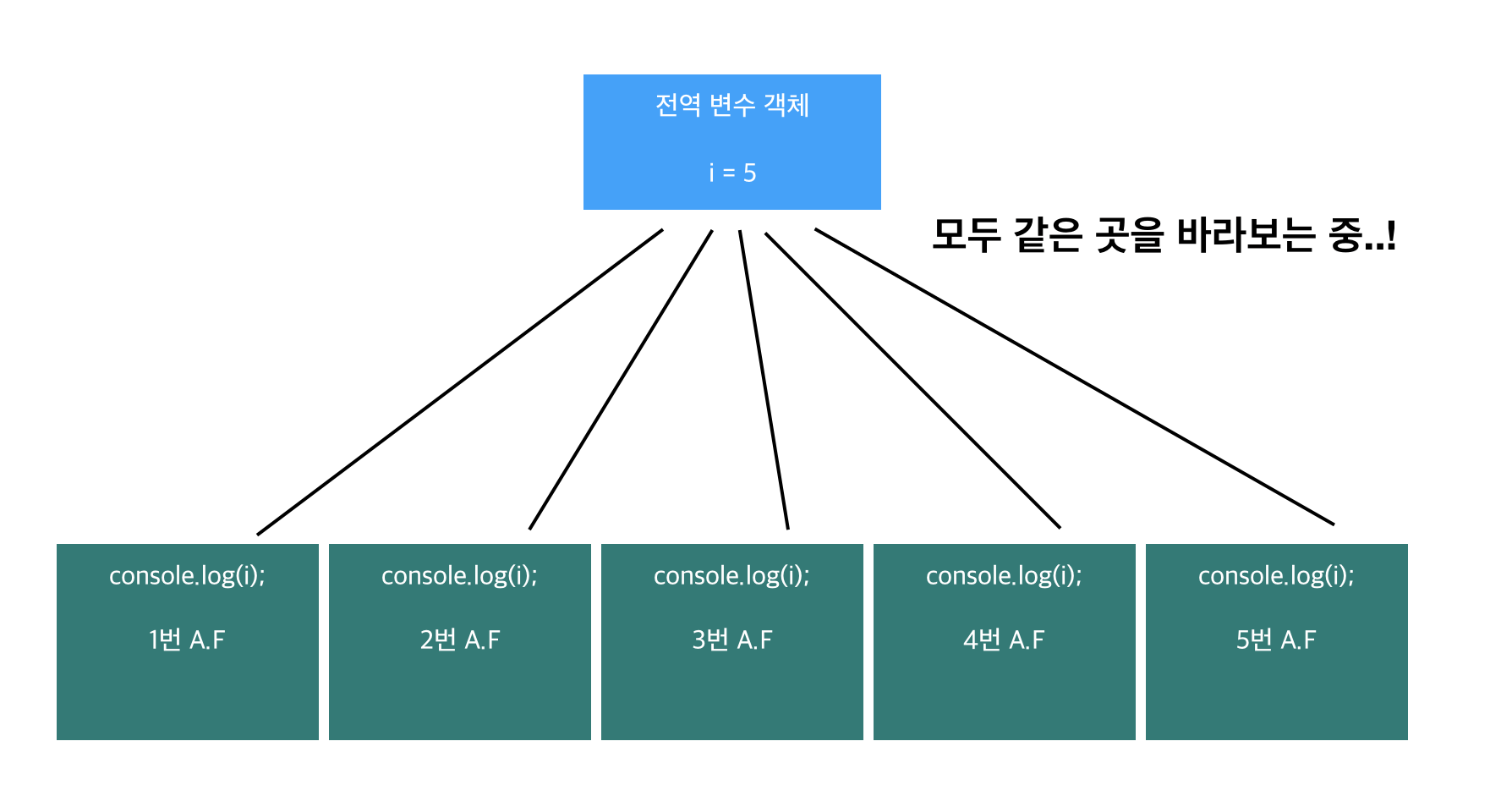 따라서, 현재 콜 스택에 있는 익명함수와 콜백 큐에 대기 중인 익명함수는 유감스럽게도 모두 5로 변화된 i를 참조하고 있는 것이죠.