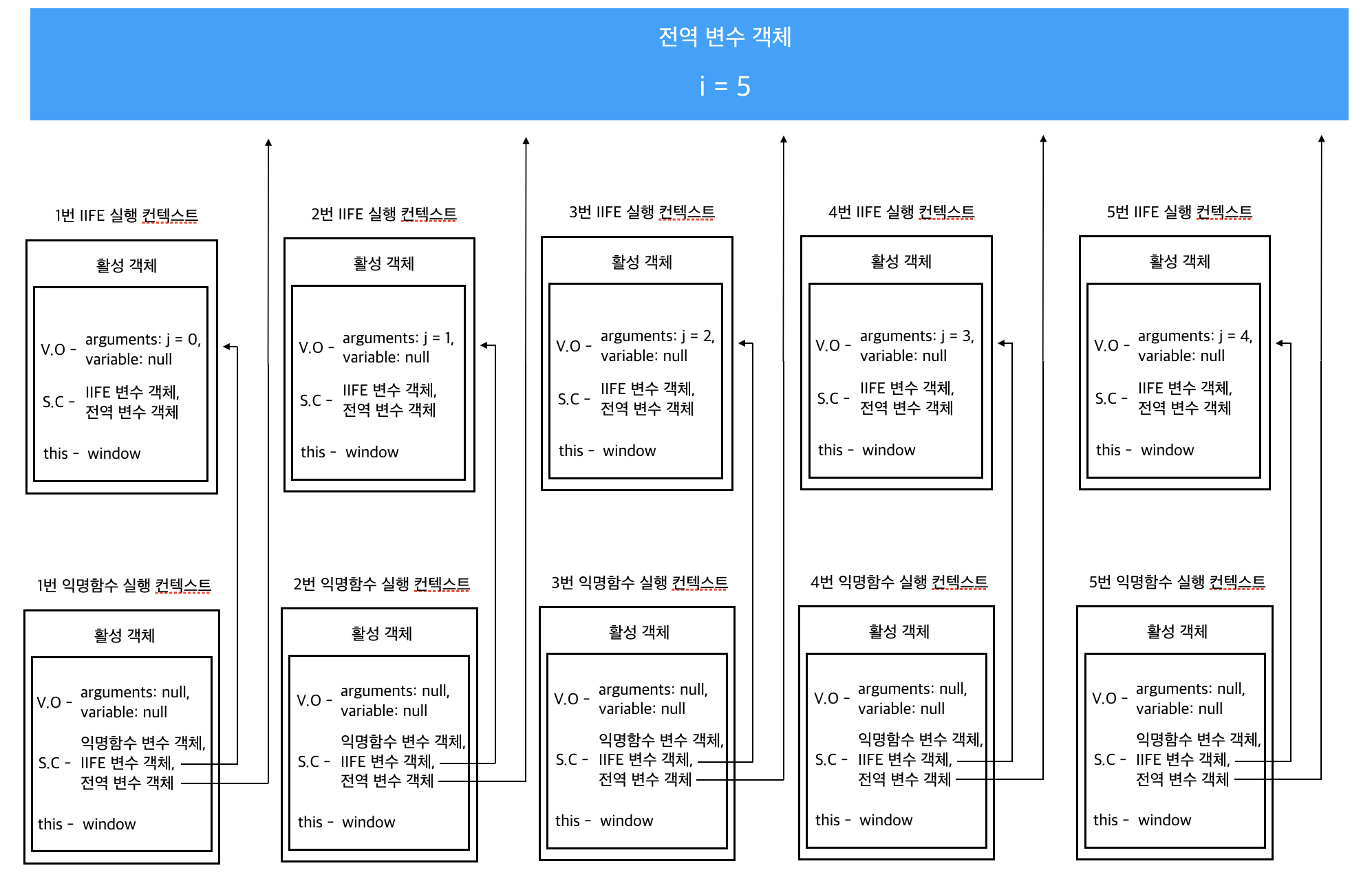 자신의 변수 객체에서는 i를 찾을 수 없으니 상위 스코프인 IIFE 스코프를 탐색하게 되고, 이 곳에서도 찾을 수 없으니 결국은 전역 스코프를 탐색하여 이미 5로 변해버린 i를 참조하게 됩니다.