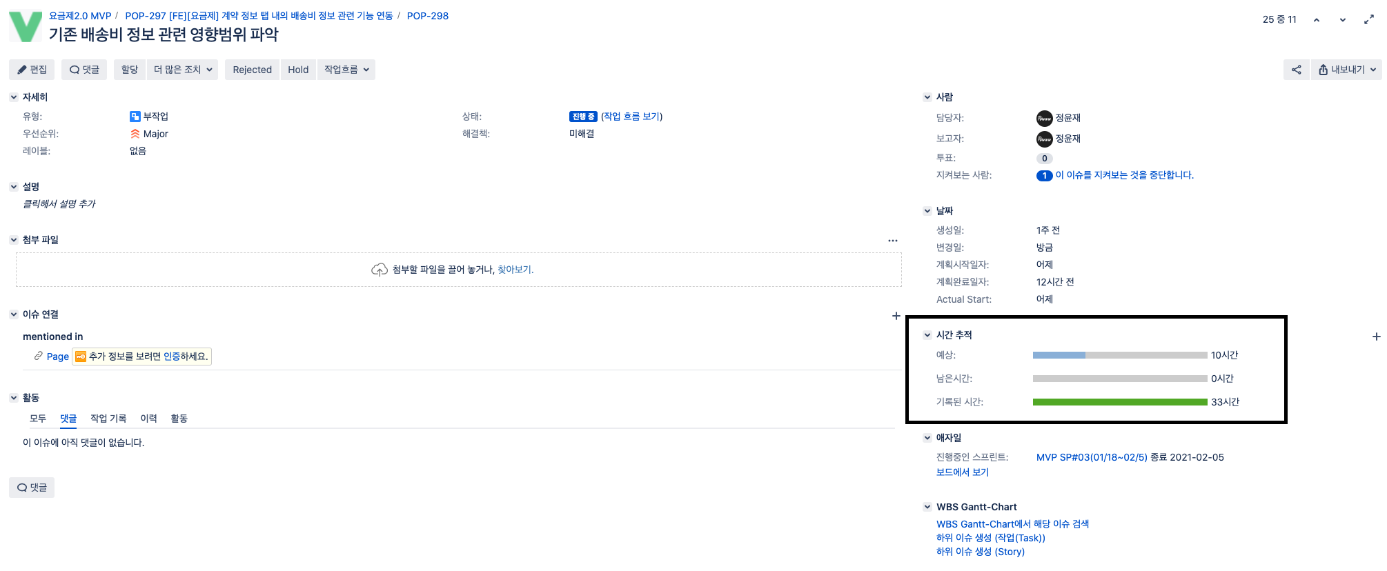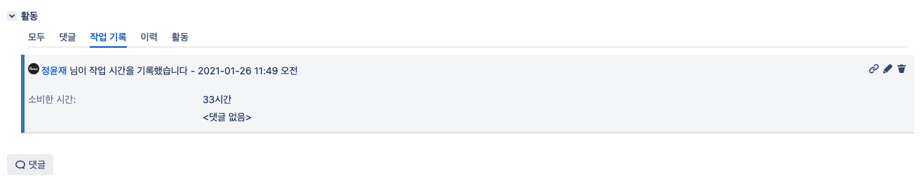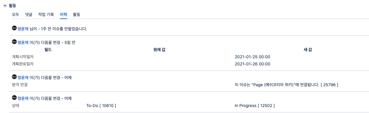 그렇기에, 상태를 '할 일'에서 '진행 중'으로 변경하거나 댓글을 남기는 등의 행위는 모두 작업 기록이 아닌 이력 탭에 남게 됩니다.