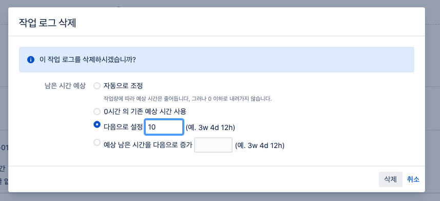 삭제가 완료됐을 때, 입력한 예상 시간 정보를 기반으로 시간 추적 정보가 원래대로 돌아온 것을 확인할 수 있게 됩니다.